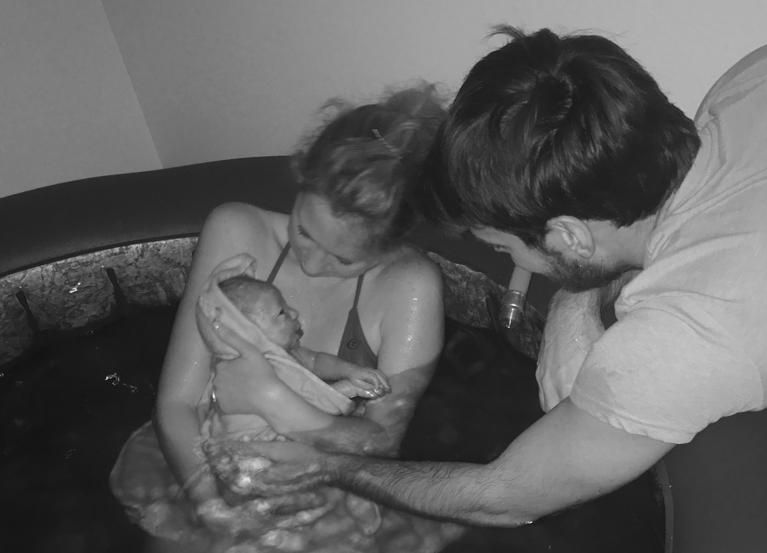The contractions pick up the pace and gain intensity once more. Your dad stays by my side. Through every contraction he leans over me and pushes on my back. As I feel one coming I motion with with my hands for him to stand up, and he knows it’s time. In between contractions he gives me sips of water as I lean on the edge of the tub or wipes my face and arms with a cold cloth. He speaks to me. He tells me I’m beautiful. That man… he’s a good one.