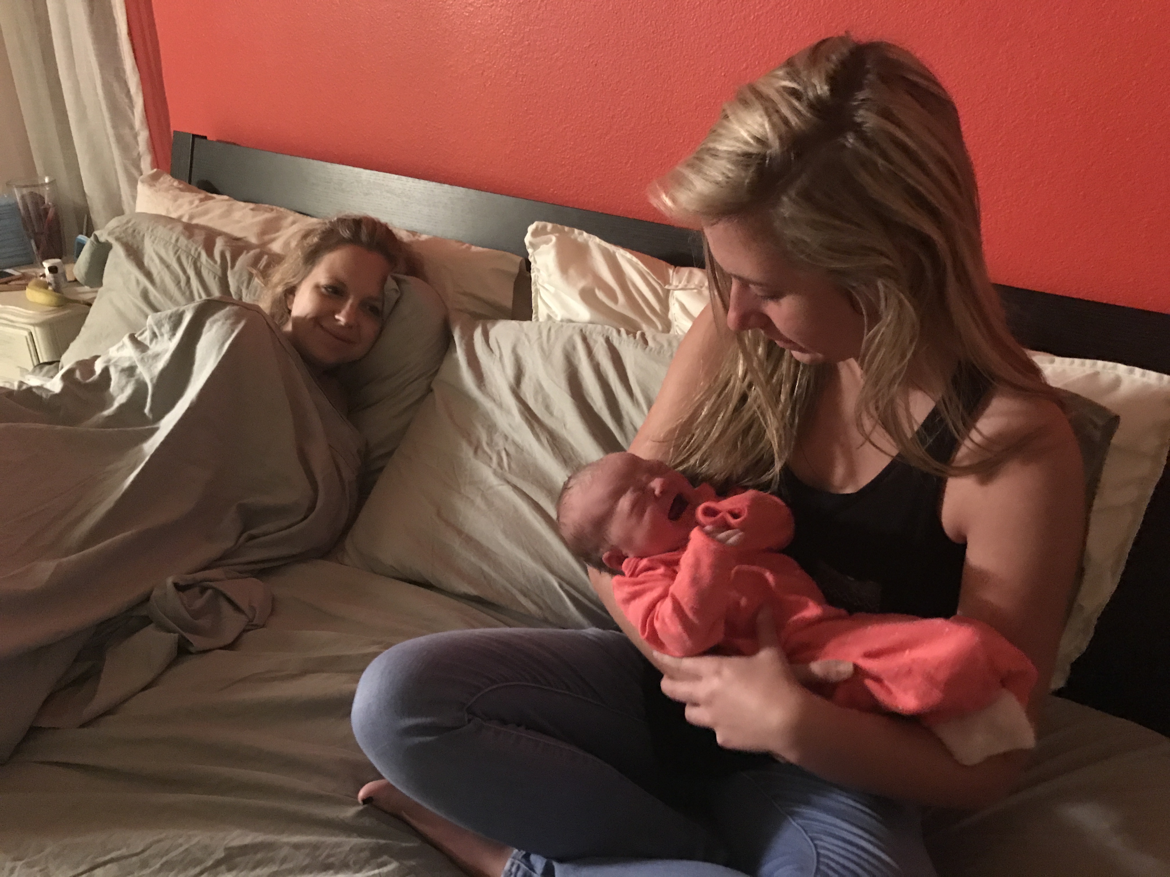 Through this time I am just waiting to feel the urge to push. I keep thinking there will be relief when I get to push. Maybe I don’t accurately remember my past birth experiences, but there was definitely not relief when it came time to push! I knew it was close – I could just start to feel the urge to bear down as the contractions would finish and then… I was pushing. Deborah called the grandmas in to take pictures and record video.