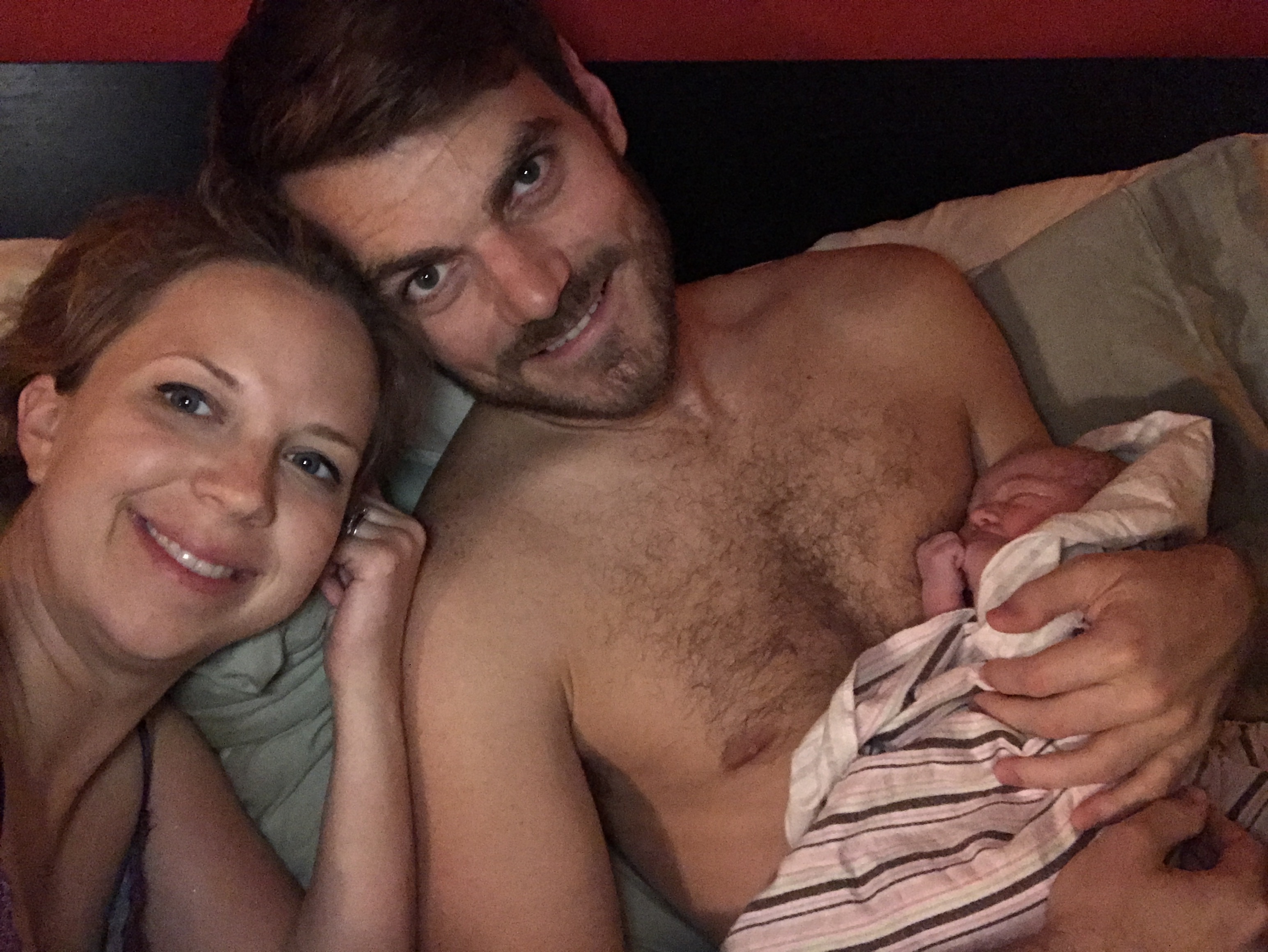 I felt so out of control. This seemed like the roughest of the births when it came to pushing. Again, probably, because it was so fast – I think about 5 minutes. As I pushed I felt the pop of my water breaking and within the next contraction or two they saw your head. As I pushed through a contraction and your head was coming out, the contraction ended with your head partially out, but not fully, and I was like, “What the heck!” I did little breaths and kept myself from pushing to prevent tearing and used my hand to support myself and help stretch around you. This was all in a matter of seconds and felt so crazy but looking back at the video, it actually wasn’t as crazy as it felt.