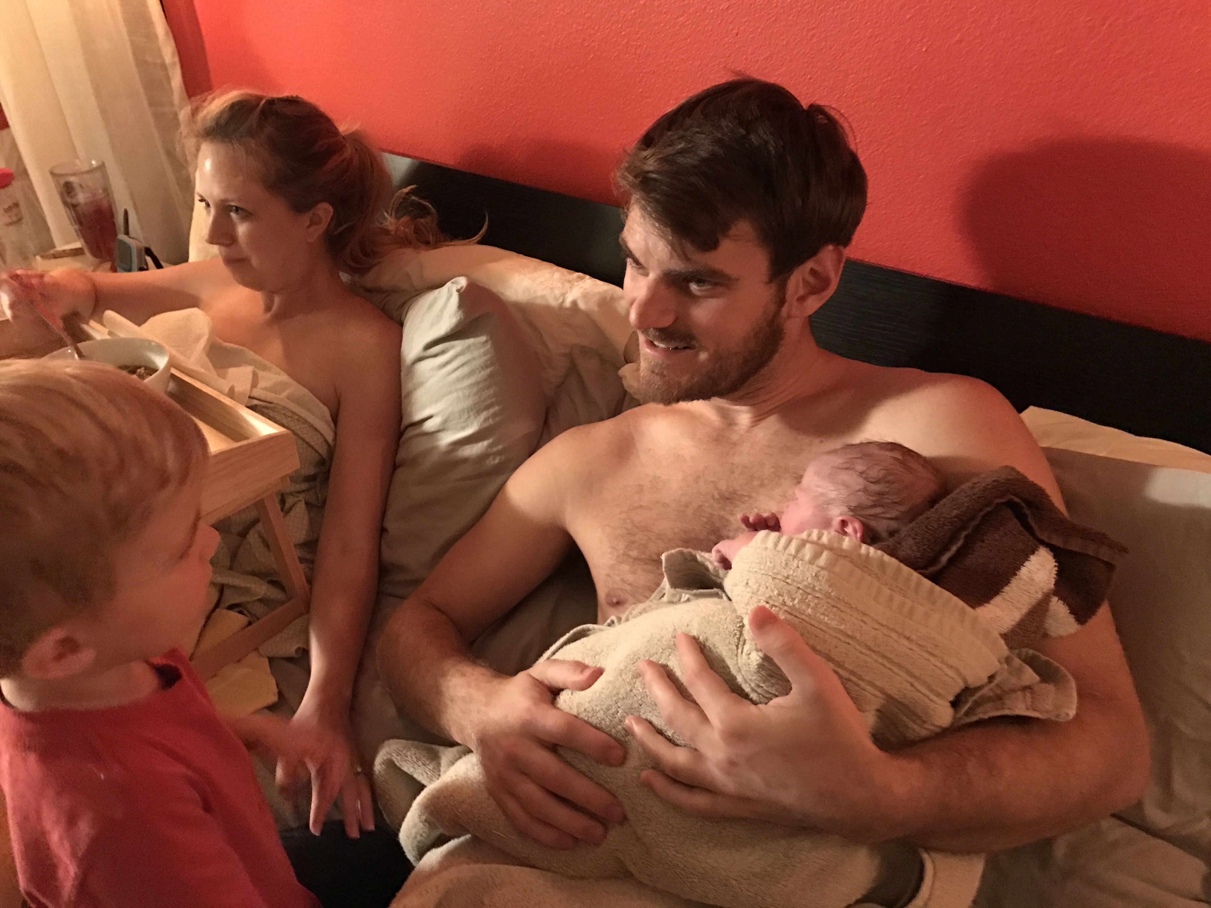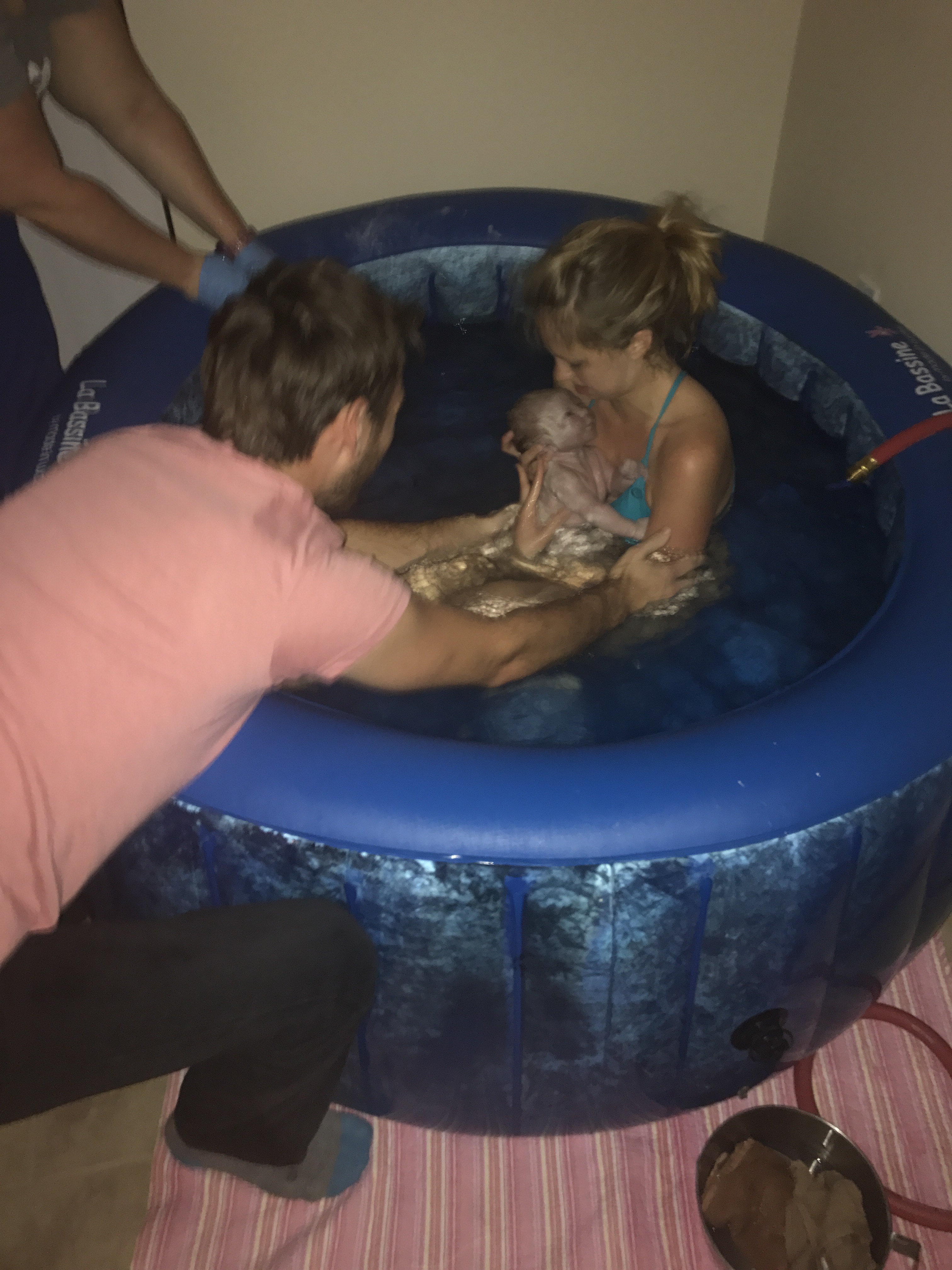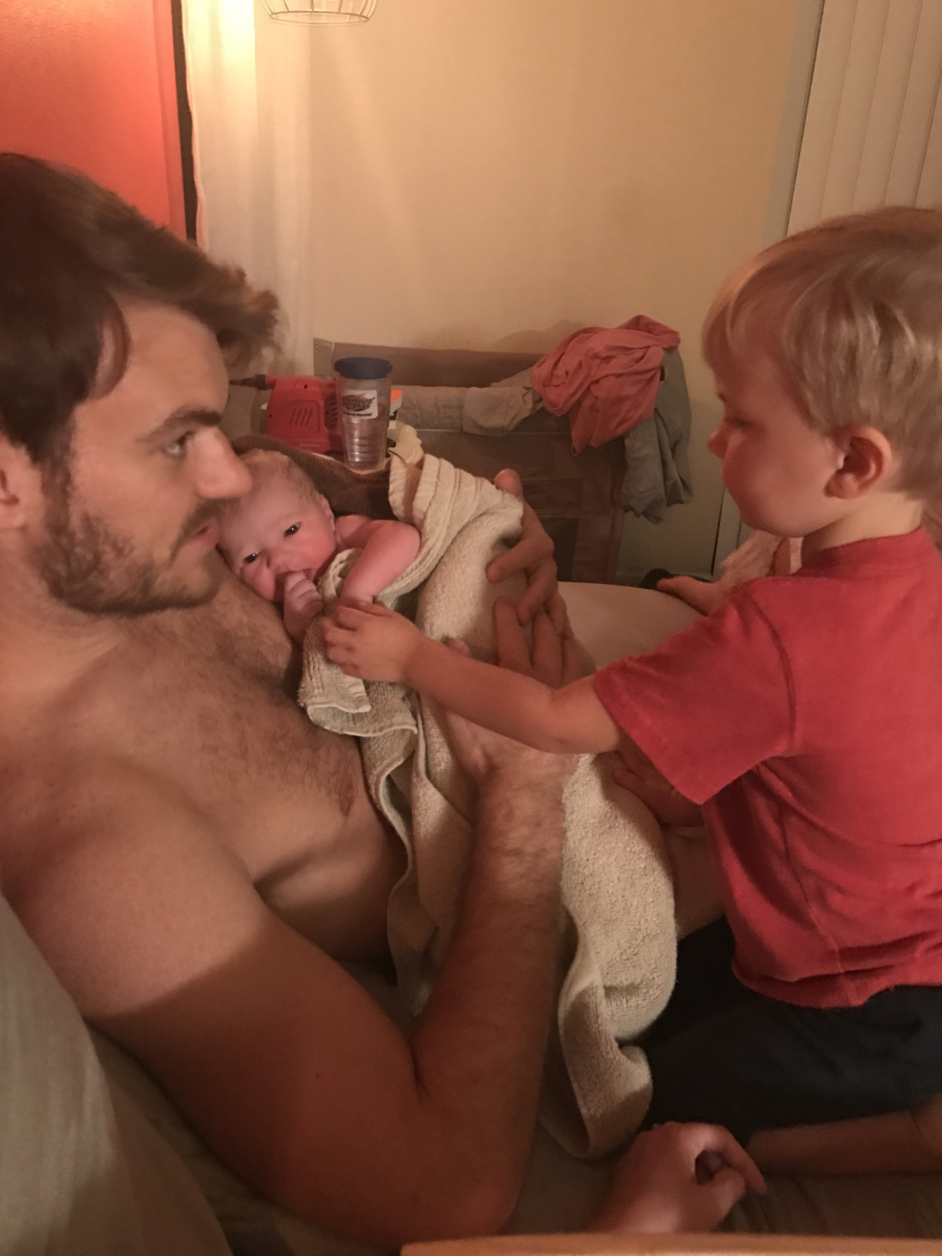 The house became a flurry of birth preparations – shower curtains on the bed topped with old sheets, your dad filling the tub halfway so it could be topped off quickly when I’d want in. The grandmas were folding laundry and putting away clean dishes. Aunt Zoe and her friend were playing with your sister and brother and baking your birthday cupcakes.