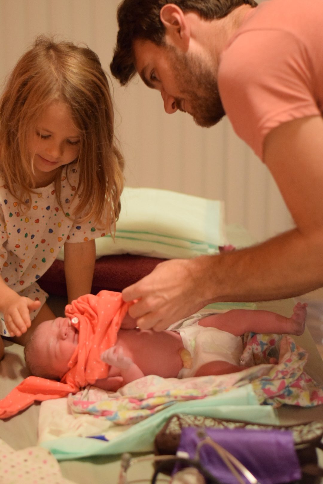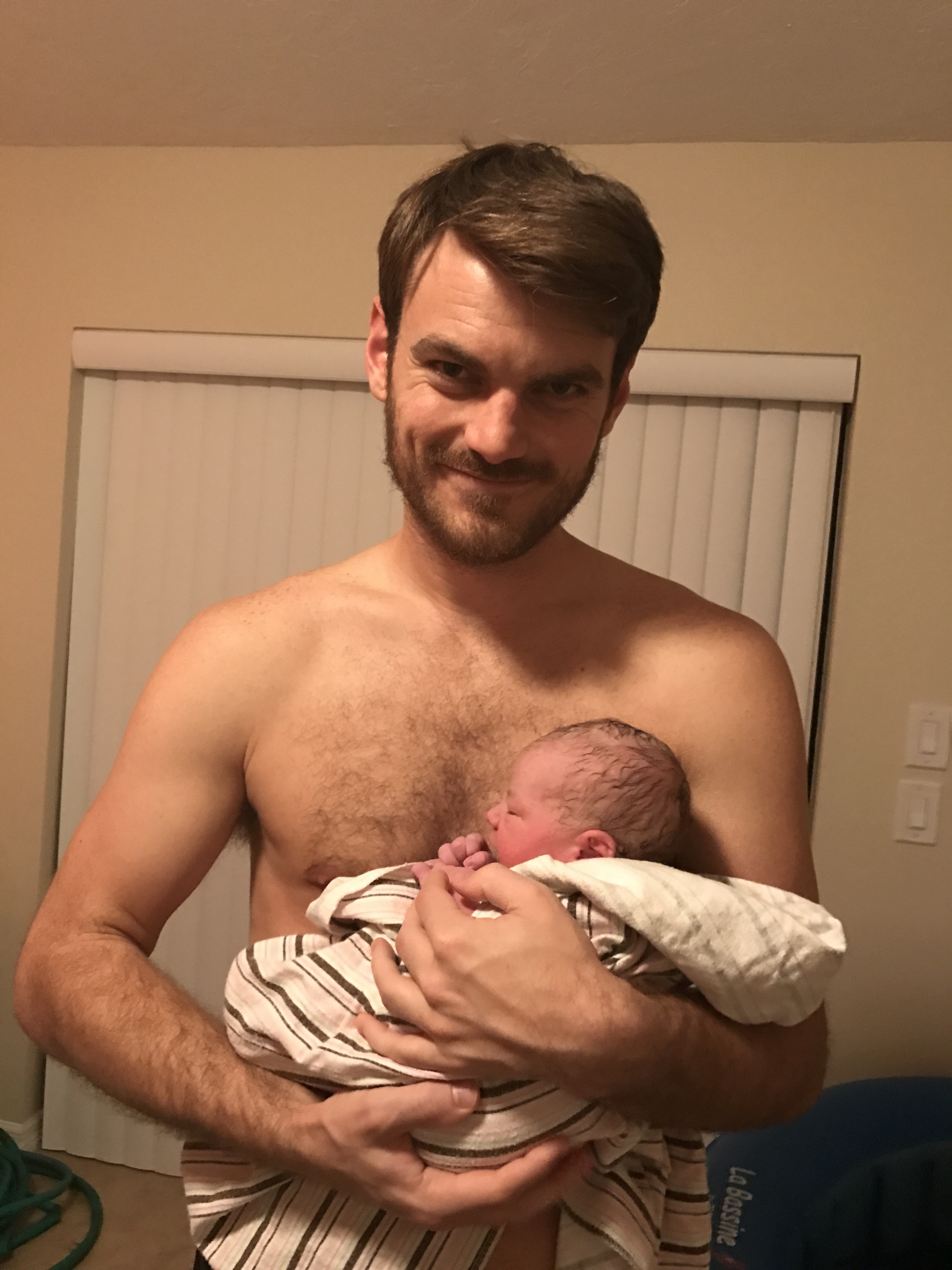 The house became a flurry of birth preparations – shower curtains on the bed topped with old sheets, your dad filling the tub halfway so it could be topped off quickly when I’d want in. The grandmas were folding laundry and putting away clean dishes. Aunt Zoe and her friend were playing with your sister and brother and baking your birthday cupcakes.