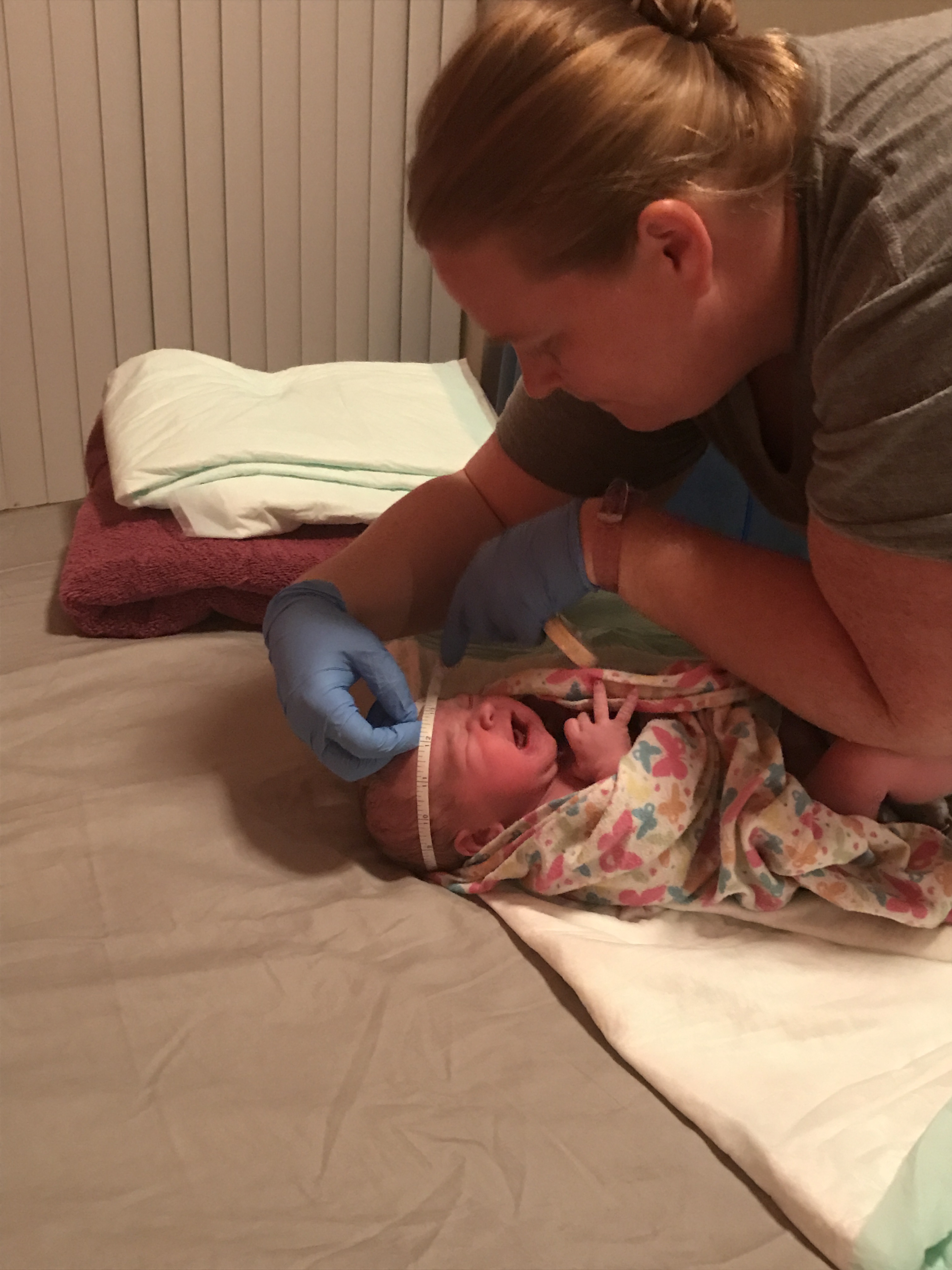 I felt so out of control. This seemed like the roughest of the births when it came to pushing. Again, probably, because it was so fast – I think about 5 minutes. As I pushed I felt the pop of my water breaking and within the next contraction or two they saw your head. As I pushed through a contraction and your head was coming out, the contraction ended with your head partially out, but not fully, and I was like, “What the heck!” I did little breaths and kept myself from pushing to prevent tearing and used my hand to support myself and help stretch around you. This was all in a matter of seconds and felt so crazy but looking back at the video, it actually wasn’t as crazy as it felt.