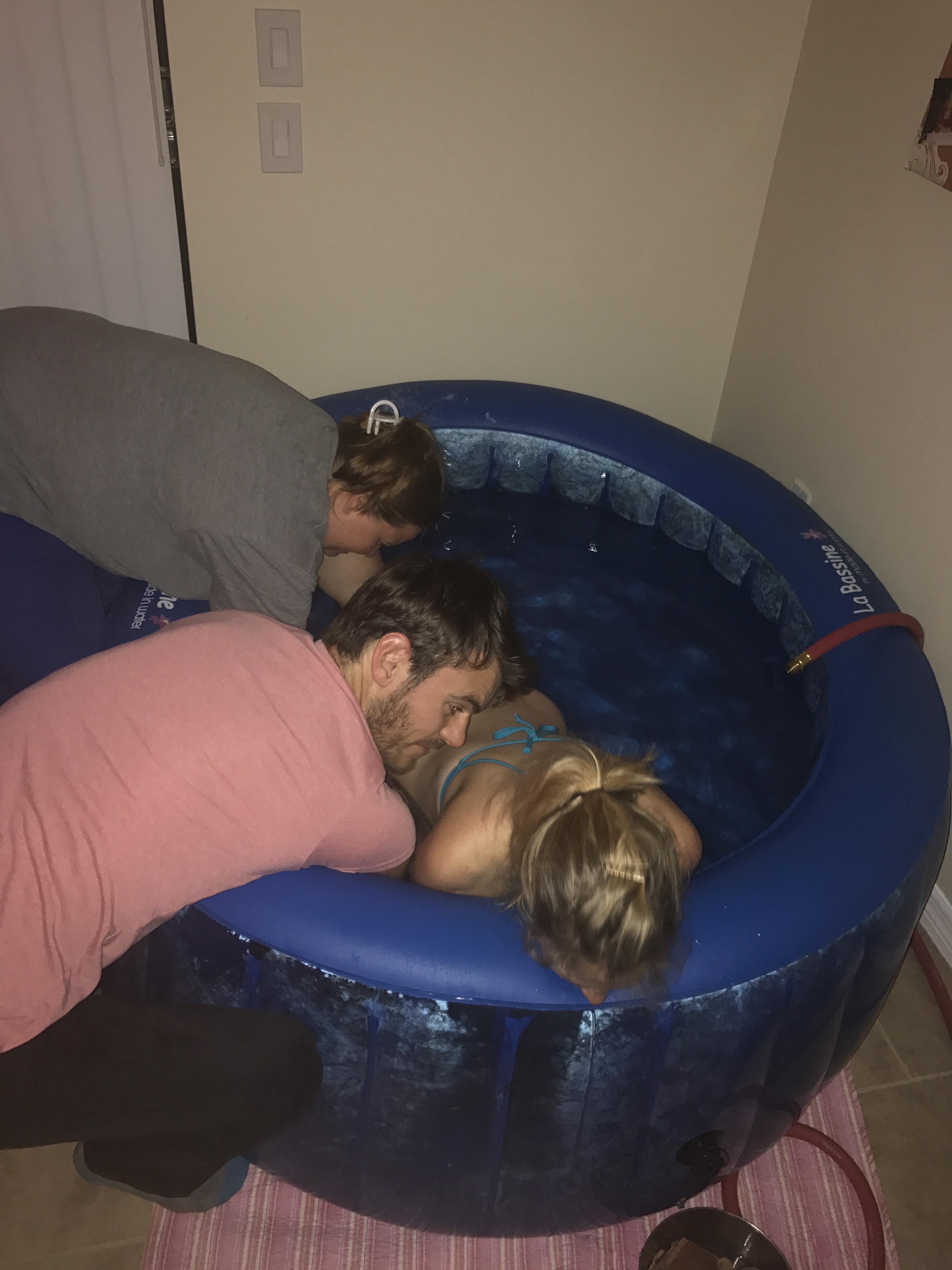 With each child, labor has gotten shorter but way more intense. My body is going from 0 to 10 in a shorter period of time, so it makes sense. It’s just not fun. At this point the tub gets filled all the way with hot water, and I ask your dad to get me undressed and in my swim suit top. I literally cannot even stand up to undress myself. He’s like, “The tub is ready. Get in.” and I’m like, “Dude I can’t get there. You gotta help me out here.” So he puts my top on me while I am on hands and knees and then gets me the 20 feet from the bathroom to the inflatable tub in our bedroom.